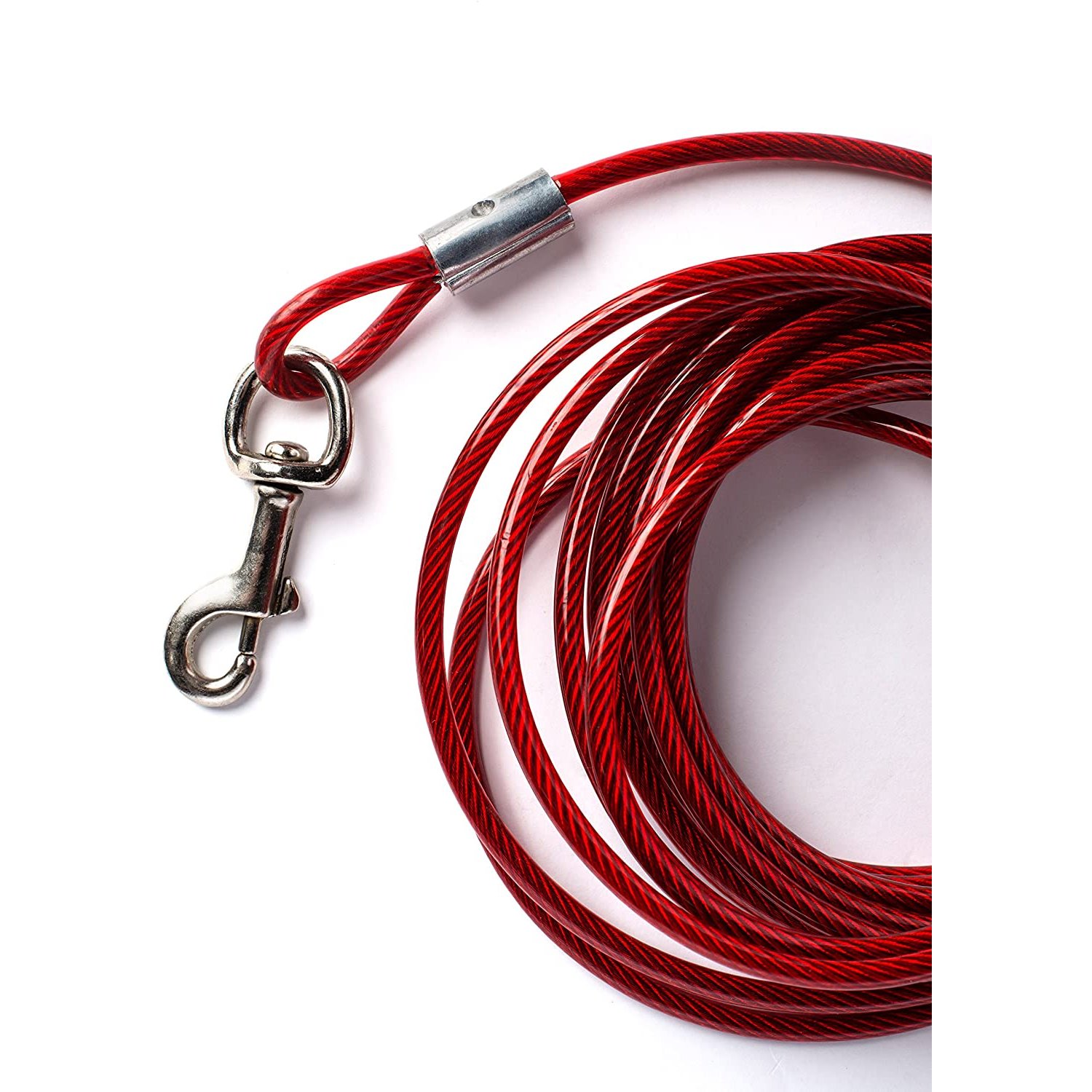 Prevue Pet Products Tie-out Trolley Set Medium-duty, galvanized wound-steel cable in crack-resistant vinyl casing, with forged iron swivel bolt snaps ends. Resists rust & corrosion when used and maintained properly. Our Trolley Set measures 50' in length.